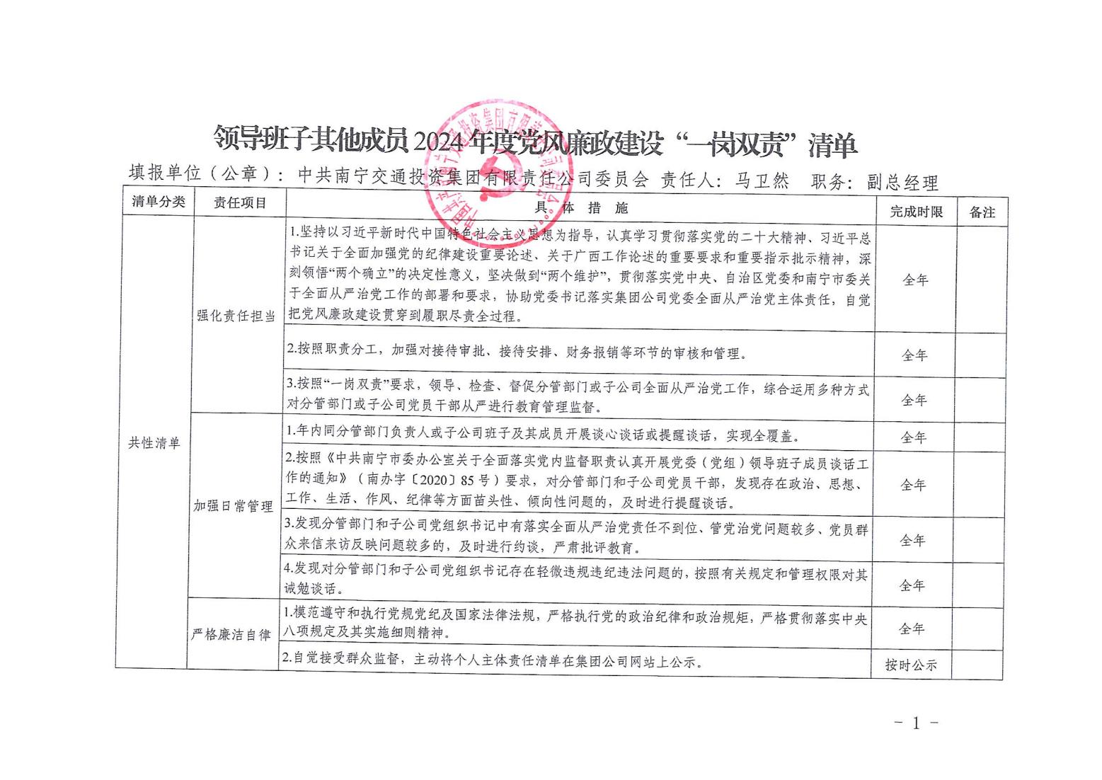 領導班子其他成員2024年度黨風廉政建設“一崗雙責”清單(六)