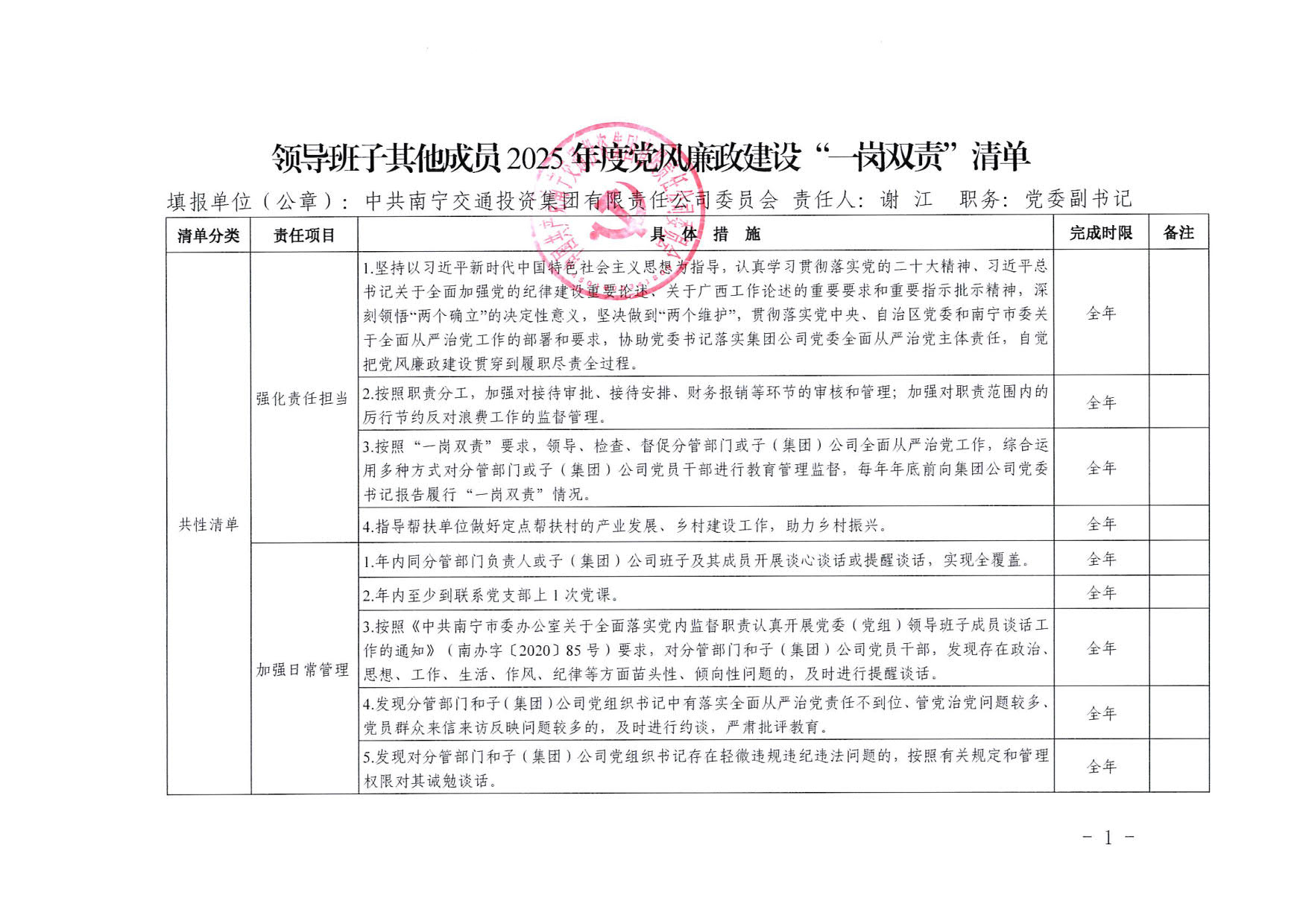 南寧交投集團領(lǐng)導班子其他成員2025年度黨風廉政建設(shè)“一崗雙責”清單(一)